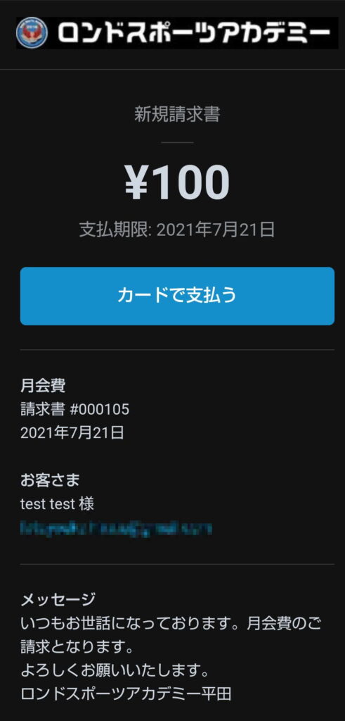 月会費をクレジット決済にした場合、Square(invoicing@messaging.squareup.com)を通して以下のメールが送られてきます。