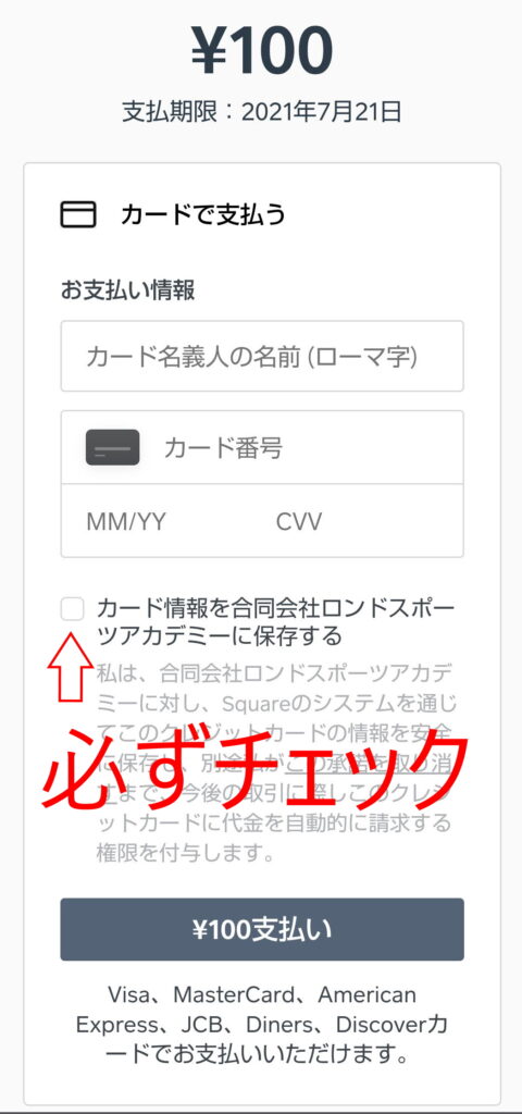 カード情報を合同会社ロンドスポーツアカデミーに保存にチェック
